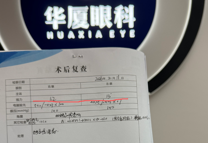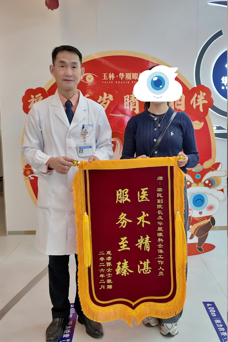 术后恢复比想象中更顺利。第二天复查,陈老师已能清晰看世界,告别厚重眼镜,画画、看远方都格外清爽。术后一周复查,视力稳定达标,眼部状态良好。为感谢梁民副院长的精湛医术与贴心服务,陈老师特意送上锦旗,表达心中谢意。现在的她,上课、生活都轻松自在,不用再被眼镜束缚。她常说:早知道摘镜这么幸福,真应该早点来玉林华厦!